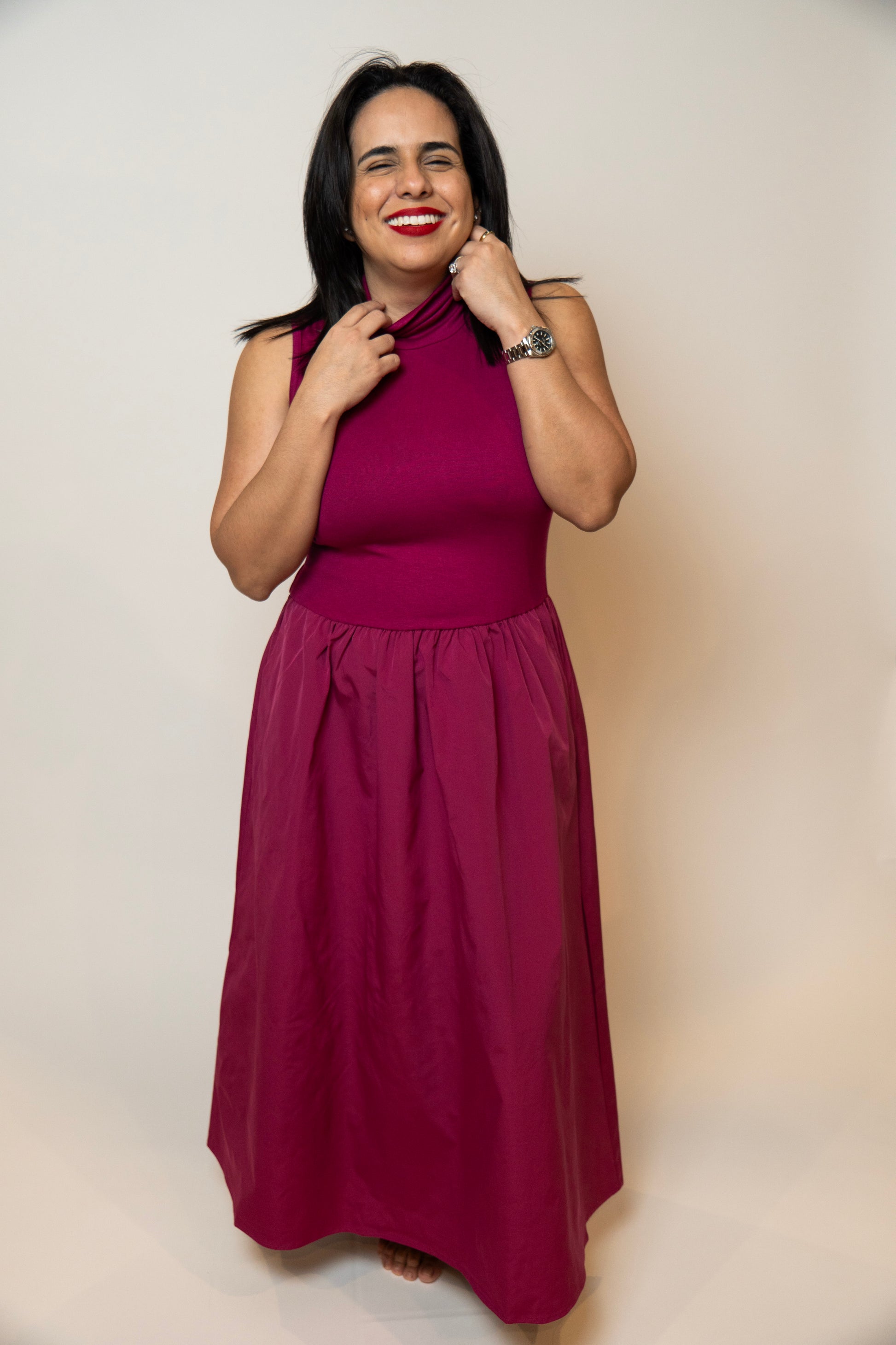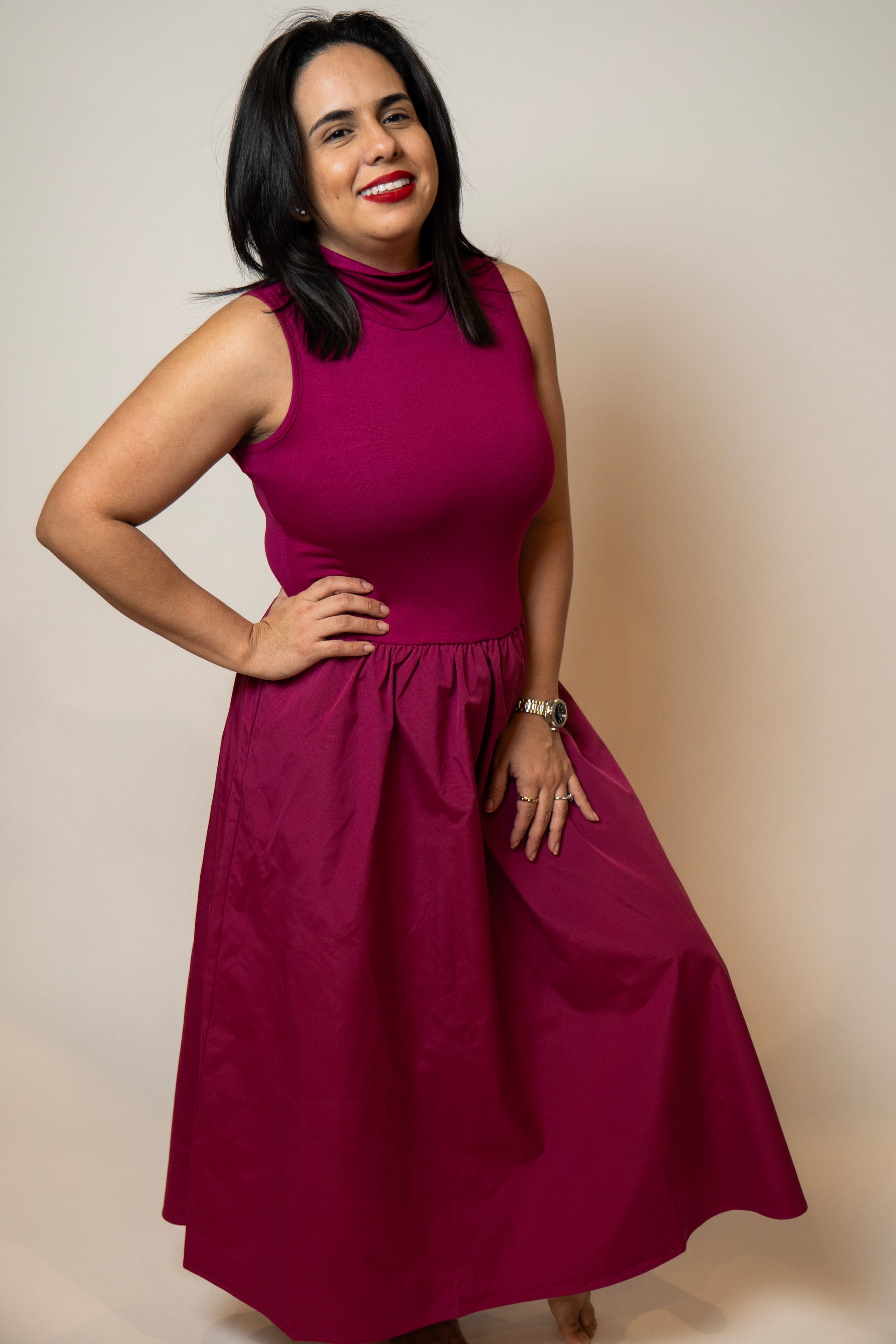 Meet your new go-to statement midi. This sleeveless mock neck dress features a soft, stretchy jersey knit bodice paired with a beautifully structured woven skirt for the perfect balance of comfort and elegance. Designed with a flattering silhouette and functional pockets (yes, really), this piece moves effortlessly from fall weddings to romantic date nights and everything in between. A refined, timeless look you’ll reach for again and again.
